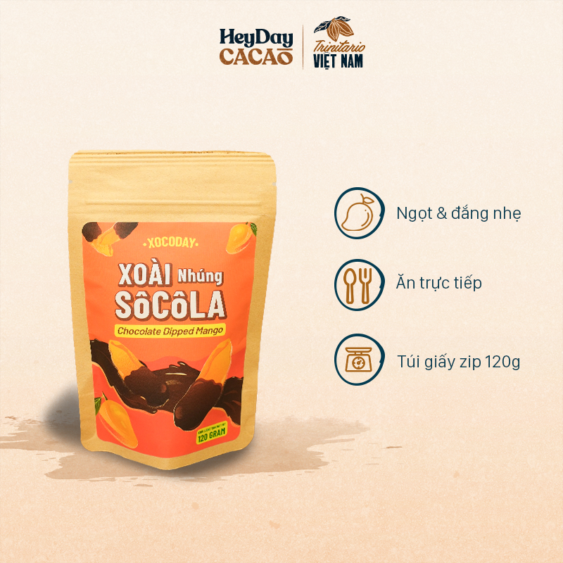 - Xoài sấy dẻo nhúng sô-cô-la là sự hòa quyện tinh tế giữa vị ngọt tự nhiên của xoài chín vàng và lớp sô-cô-la đắng béo nhẹ phủ vừa đủ ở phần đầu miếng xoài.
